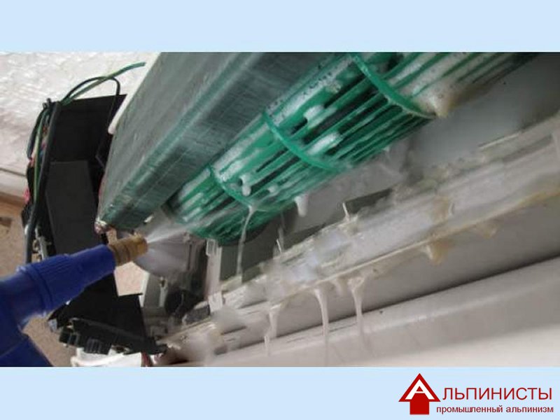 Вымыть внешний блок обычными бытовыми средствами нереально. Мастера компании «Альпинисты» всегда используют профессиональную мойку высокого давления с применением специальных моющих средств. Механическая очистка абсолютно неэффективна.